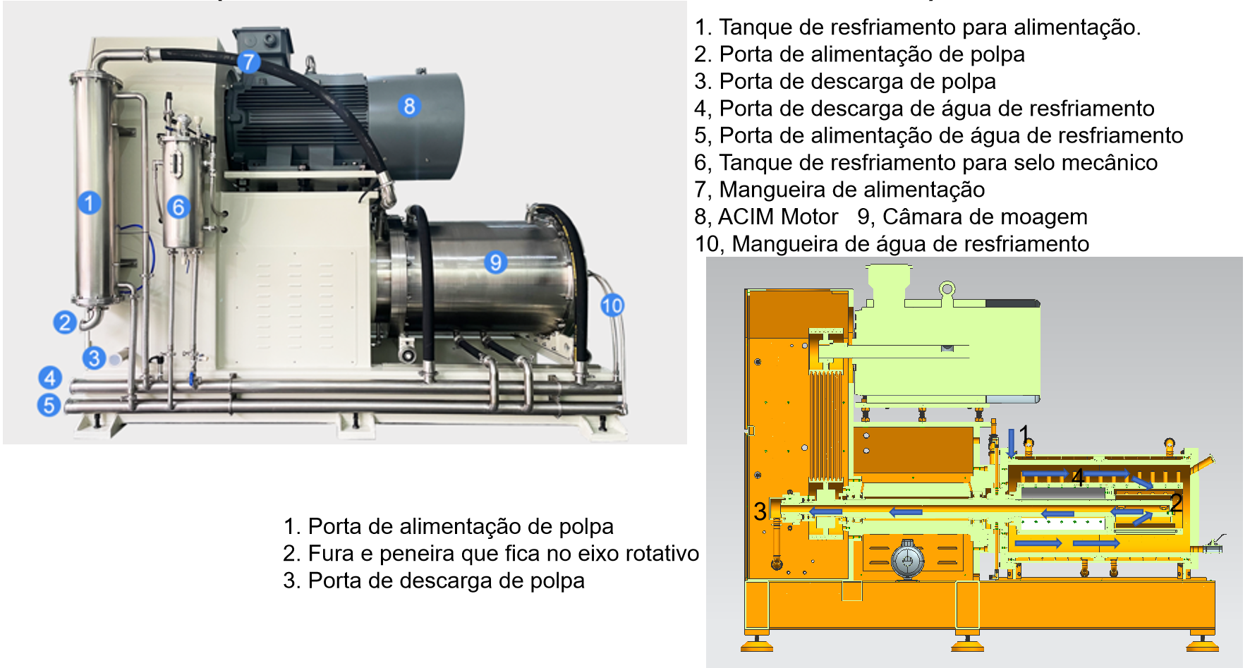 Capa de refrigeración optimizada instalada externamente a la cámara de molienda, serpentín de refrigeración debajo del tamiz y dispositivo de refrigeración para el sello mecánico para controlar el aumento de temperatura por debajo de 20 grados.