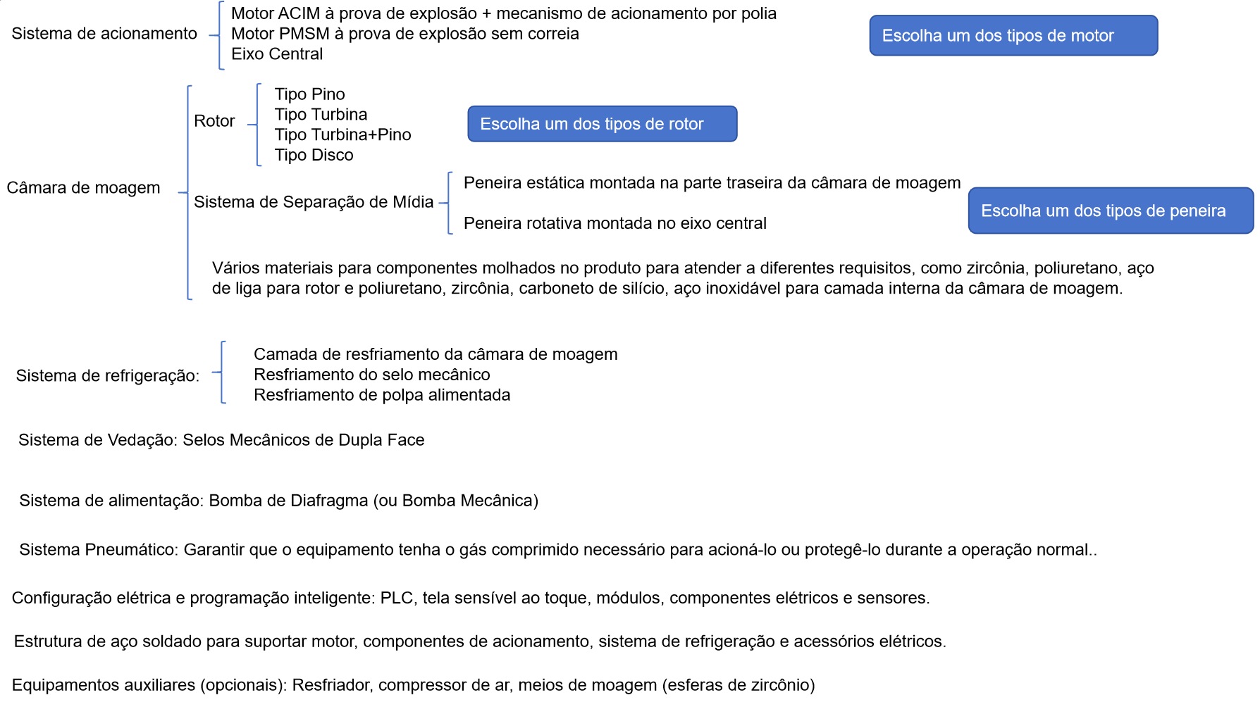 Diversos materiales para los componentes en contacto con el producto, que cumplen con diferentes requisitos, como zirconio, poliuretano y acero aleado para el rotor, y poliuretano, zirconio, carburo de silicio y acero inoxidable para la capa interna de la cámara de molienda.